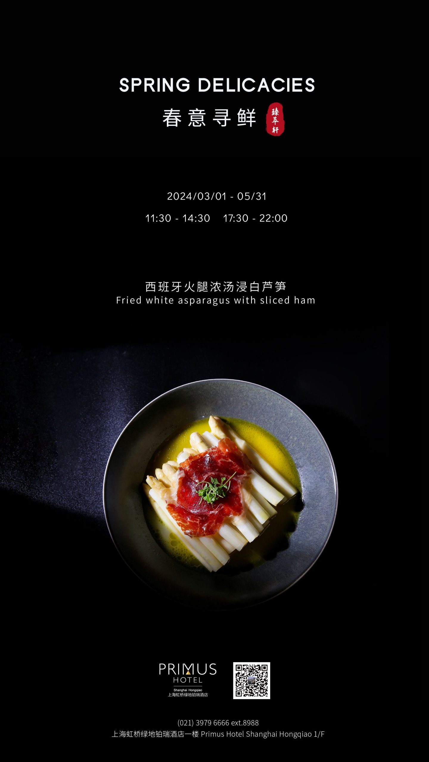 臻萃轩中餐厅行政主厨雷志军匠心独运,以春日的丰盛馈赠,将时令食材点缀于每一道菜肴,以期唤醒沉睡的味蕾,以一份精致的饕餮之宴,迎接这个美好的季节。西班牙火腿浓汤浸白芦笋,汤汁浓郁而鲜美,火腿的咸香与芦笋的清甜相得益彰。胡椒兰花干河蚌腌笃鲜,蚌肉与腌笃鲜的鲜美口感,搭配恰到好处胡椒的微辣,别有一番风味。