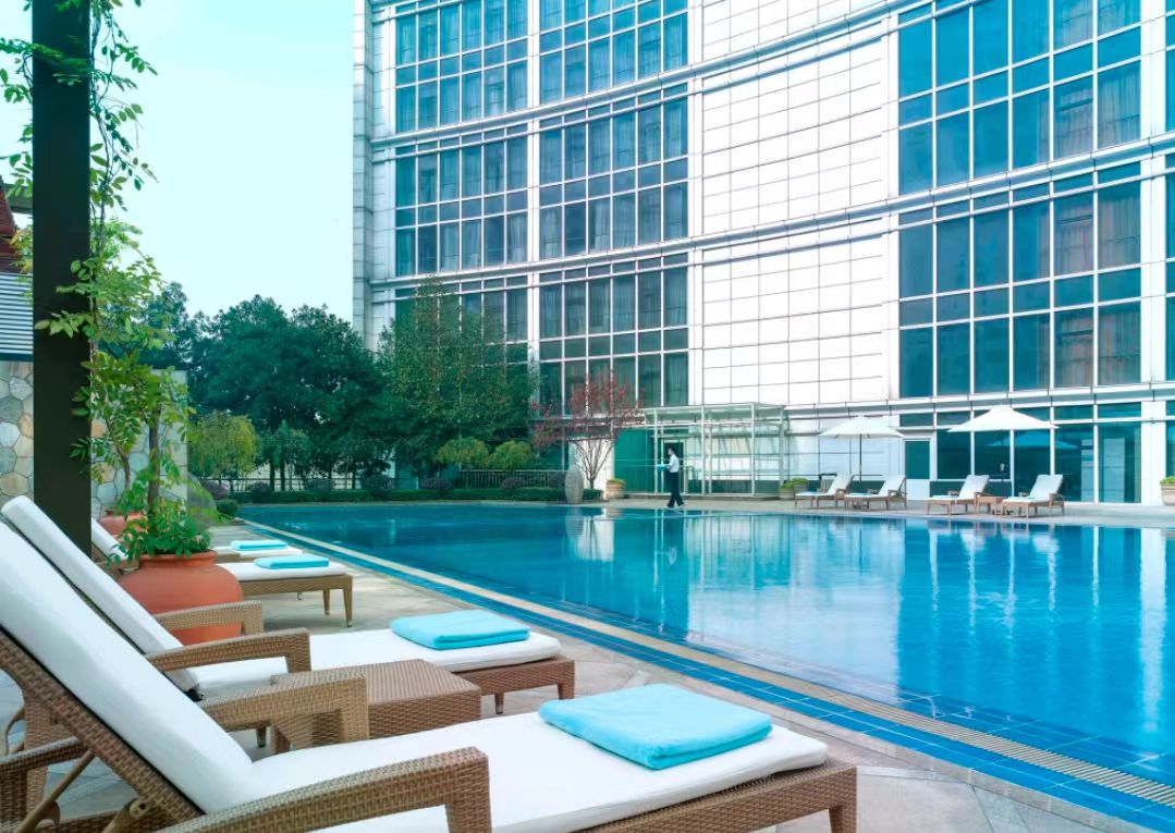 酒店的户外泳池,宛如都市中的一方碧蓝秘境,池水清澈透亮,倒映着蓝天与摇曳树影,为炎炎夏日带来沁凉慰藉,宾客在畅游之余可慵懒小憩,享受日光浴或品尝清凉饮品。