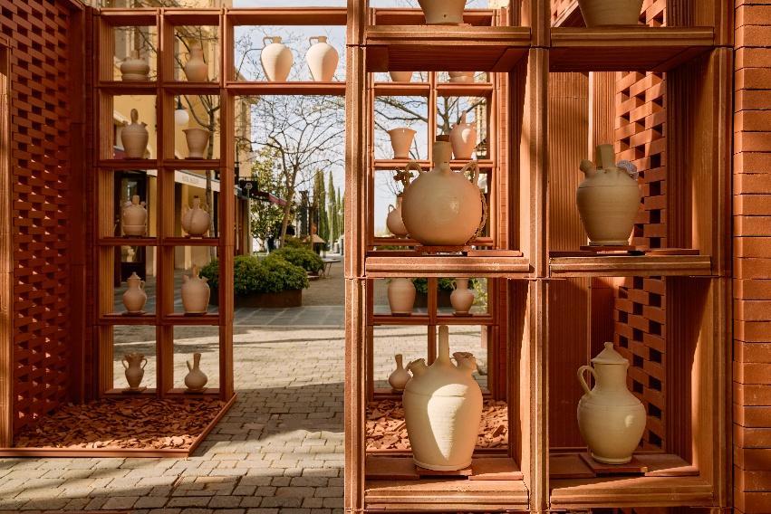 25周年“Mano a Mano”活动中,以陶瓷、纺织品、天然纤维为脉络展开匠艺对话。陶艺家Adriana Cabello探索不可复制之美,创作独一无二的陶艺作品,Bussoga工作室以三度烧制釉面工艺重塑的瓷砖艺术,Andrea Santamarina在玻璃屋中呈现的地中海工艺新生,共同构成传统与创新的对话场域。此前购物村亦与西班牙诗人Sara Bueno合作,融合工业美感与诗意韵味传递情感哲思,搭配信箱、爱心礼盒装置及快闪市场,让购物场景升华为心灵共鸣的情感空间。