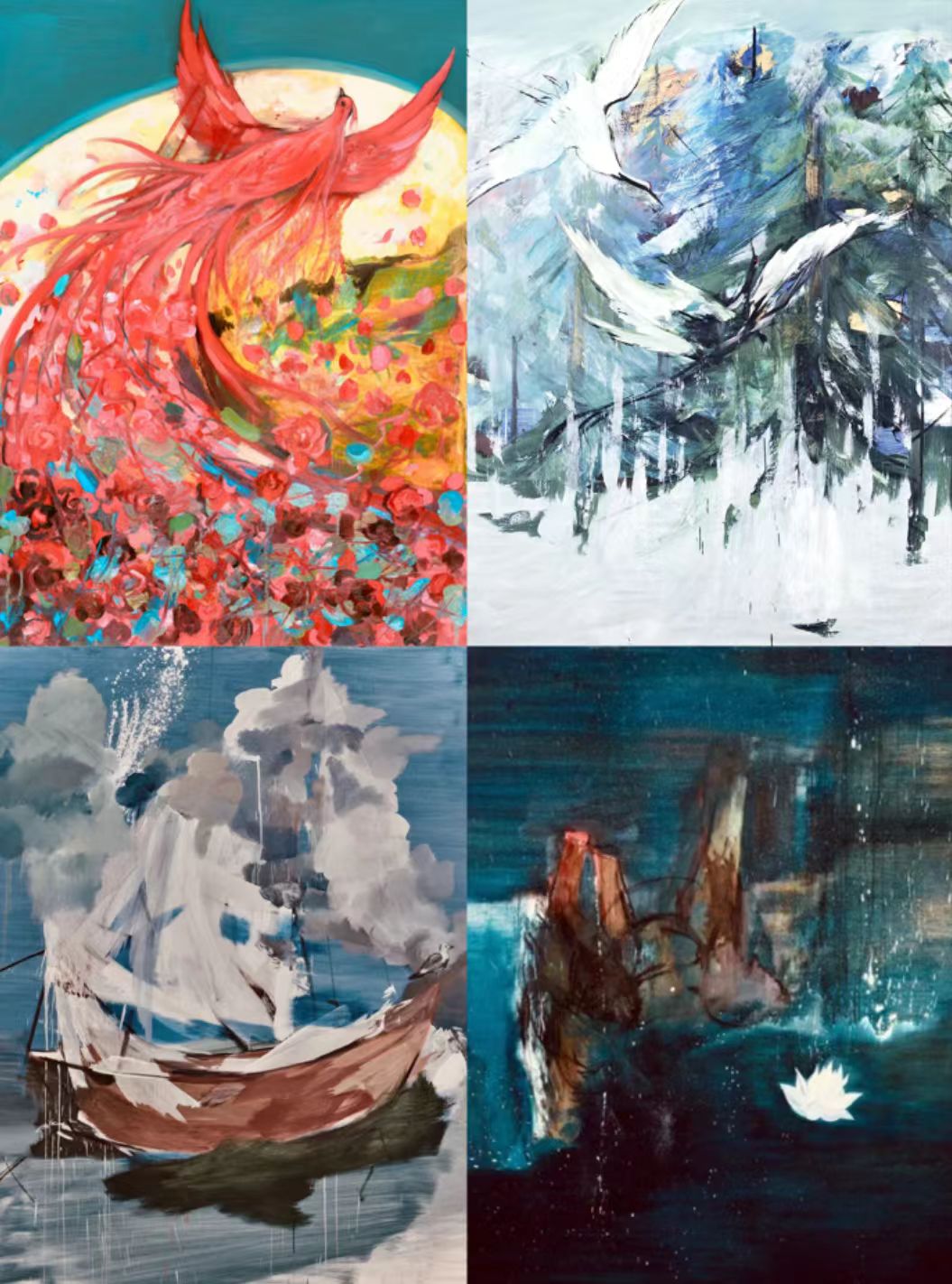 “涅槃凤影”艺术展以艺术家迟首飞最具代表性的《凤凰涅槃》系列画作为核心,呈现“浴火重生”的东方精神。作品以《凤凰涅槃》、《火凤》、《青鸾》、《彼岸花》、《松鹤图》、《白莲花》 《一叶菩提》等意象,将凤凰的炽烈与莲花的纯净、彼岸花的希望、松鹤的长青交织,一叶菩提的慈悲心展现给宾客,并传递“向死而生、生生不息”的深刻哲思, 也表达了“新生,希望及对美好未来的向往。
