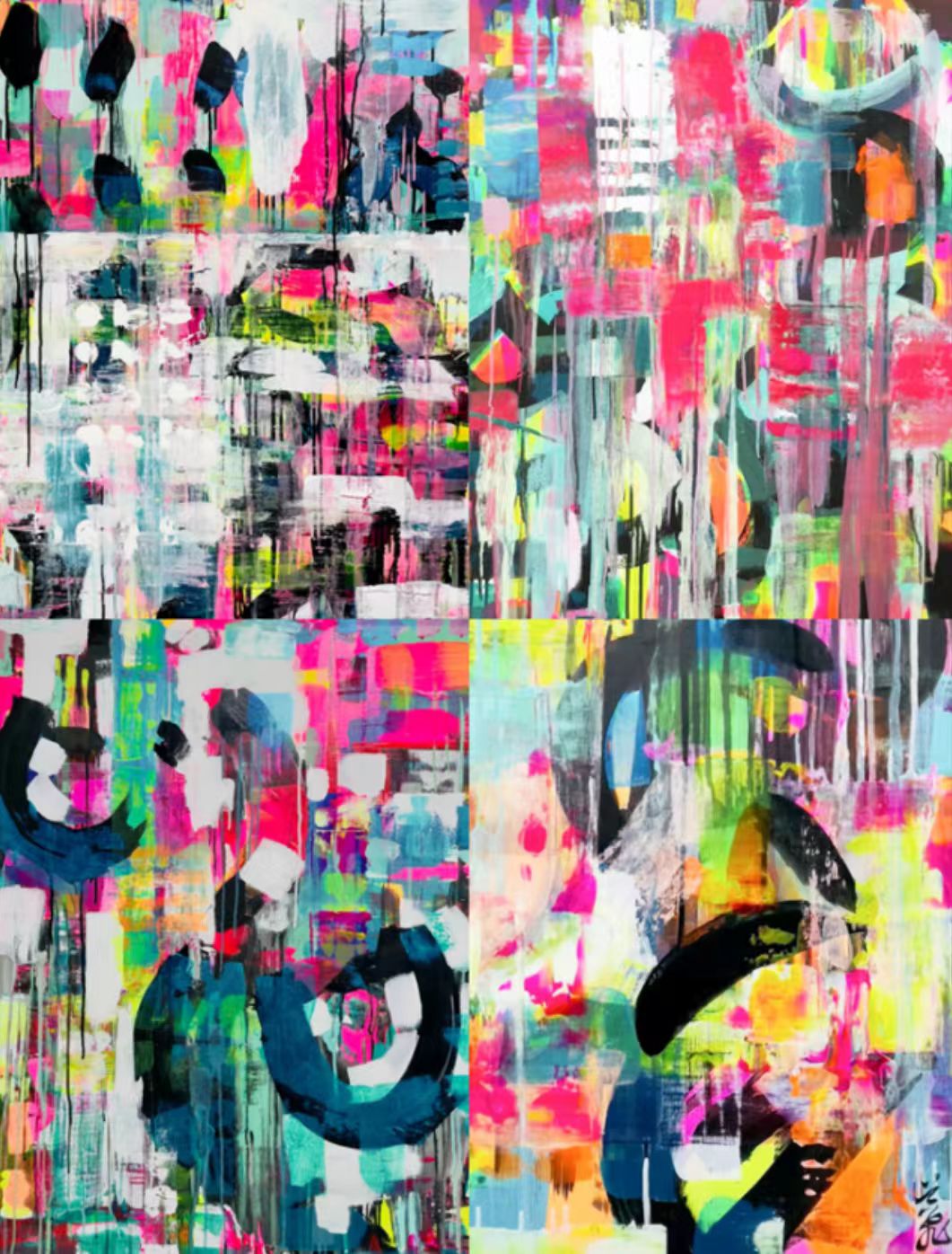 中国文化的千年积淀中,象形字作为文字的起源,以独特的符号将世间万象凝练成表意符号。这些充满生命力的文字既是记录文明的工具,也是承载东方美学的艺术基因。艺术家迟首飞通过西方抽象艺术的自由语言与中国象形字的深邃内涵想融合,打造了《曲水流觞》系列作品。作品以绚丽的色彩、灵动的笔触,让古老文字在当代艺术语境中焕发新生,构建起跨越时空与文化的视觉对话。本次艺术展同步展出了艺术家迟首飞《曲水流觞》系列作品中的《饮马江湖》 《风花雪月》《寿》《月印》等艺术化画作,画作以抽象和艺术化的甲骨文解构千年文字律动,让观众在笔墨间感受文明的重生。