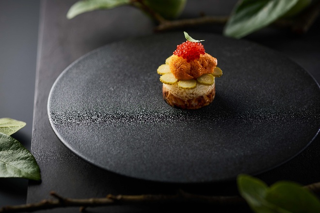 指橙海胆文思豆腐蟹肉冻:菜品灵感源自淮扬名菜“文思豆腐”。嫩豆腐细切如丝,佐以蟹肉,鲜甜交融。海胆与指橙点缀其上,鲜美柔滑和丰腴酸爽的口感巧妙平衡,打造出一道融合传统风雅与江南韵味创新表达的时鲜美馔。