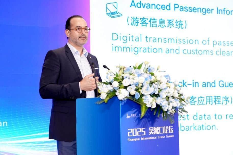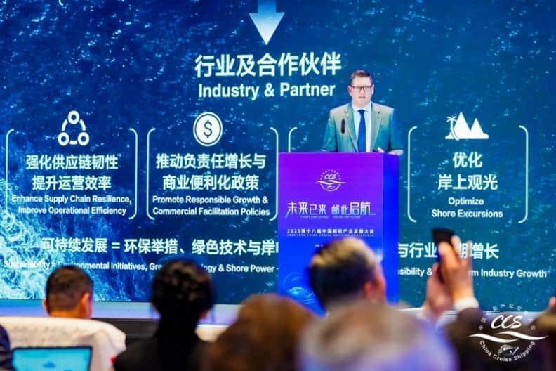 国际邮轮协会(CLIA)全球主席、皇家加勒比游轮集团总裁兼首席执行官杰森·利伯蒂(Jason Liberty)在开幕式发表视频主旨演讲